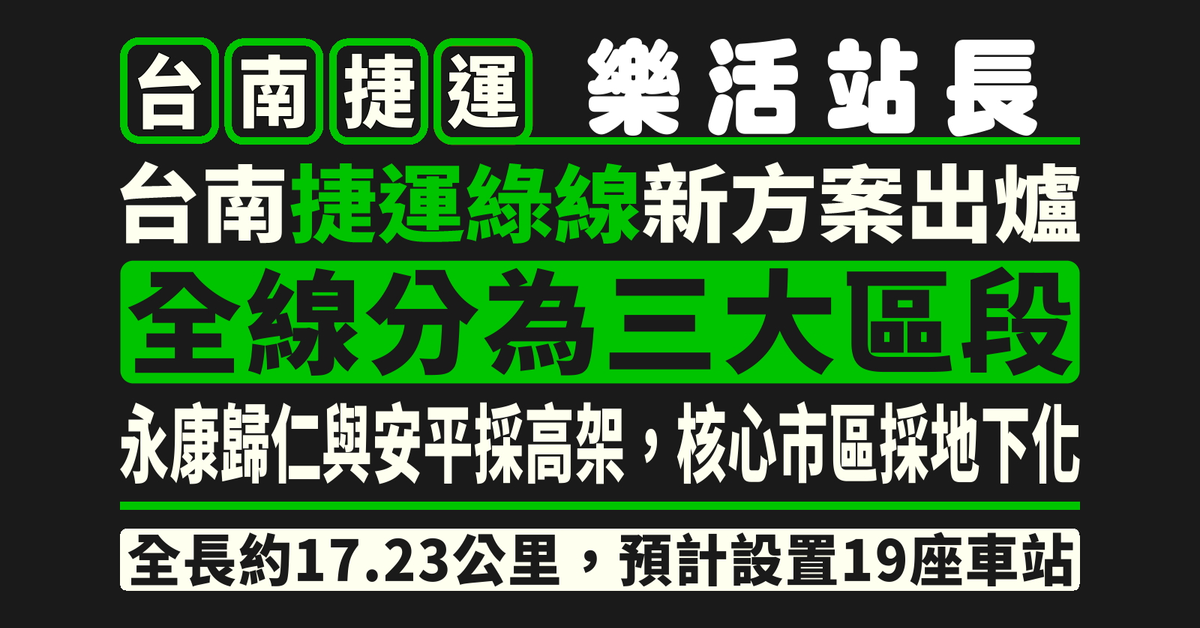 ?這樣改你怎麼看?台南捷運綠線新版方案出爐! 台南捷運綠線改版方案出爐,全長約17.23公里,預計設置19座車站。核心市區段將採地下化設計,西延至永華路二段建平路口出土,以降低對景觀與交通的衝擊,出土段設在中央分隔帶,工程費用僅增加約6%。...?這樣改你怎麼看?台南捷運綠線新版方案出爐! 台南捷運綠線改版方案出爐,全長約17.23公里,預計設置19座車站。核心市區段將採地下化設計,西延至永華路二段建平路口出土,以降低對景觀與交通的衝擊,出土段設在中央分隔帶,工程費用僅增加約6%。...?這樣改你怎麼看?台南捷運綠線新版方案出爐! 台南捷運綠線改版方案出爐,全長約17.23公里,預計設置19座車站。核心市區段將採地下化設計,西延至永華路二段建平路口出土,以降低對景觀與交通的衝擊,出土段設在中央分隔帶,工程費用僅增加約6%。...