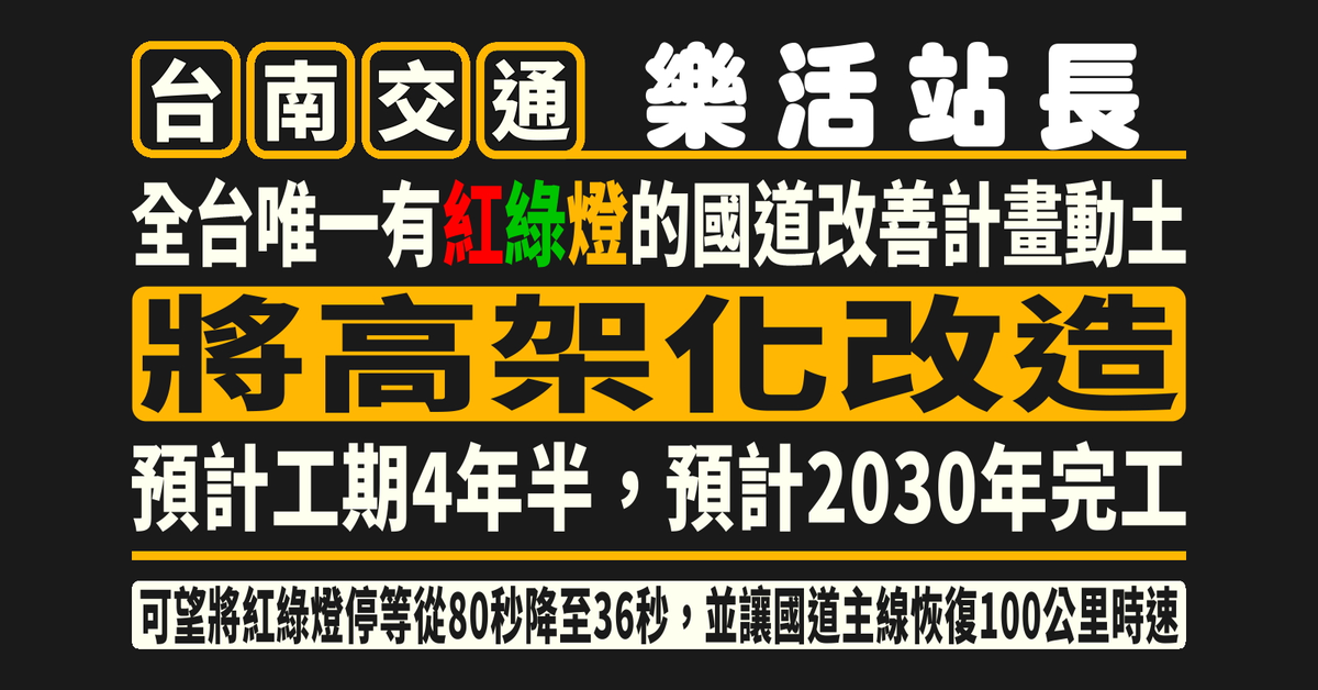 ?全台唯一有紅綠燈的國道,終於要動工改善了!你怎麼看? 困擾多年的國道8號台南系統交流道與南133線平交路口,即將高架化改造。 這是全台唯一有交通號誌的國道路段,因設計受早期地方民意壓力影響,讓國道車流需停紅綠燈,引發車流回堵與事故問題。 新工程將於南133線設置高架橋,並增設東、西向匝道、拓寬側車?全台唯一有紅綠燈的國道,終於要動工改善了!你怎麼看? 困擾多年的國道8號台南系統交流道與南133線平交路口,即將高架化改造。 這是全台唯一有交通號誌的國道路段,因設計受早期地方民意壓力影響,讓國道車流需停紅綠燈,引發車流回堵與事故問題。 新工程將於南133線設置高架橋,並增設東、西向匝道、拓寬側車?全台唯一有紅綠燈的國道,終於要動工改善了!你怎麼看? 困擾多年的國道8號台南系統交流道與南133線平交路口,即將高架化改造。 這是全台唯一有交通號誌的國道路段,因設計受早期地方民意壓力影響,讓國道車流需停紅綠燈,引發車流回堵與事故問題。 新工程將於南133線設置高架橋,並增設東、西向匝道、拓寬側車