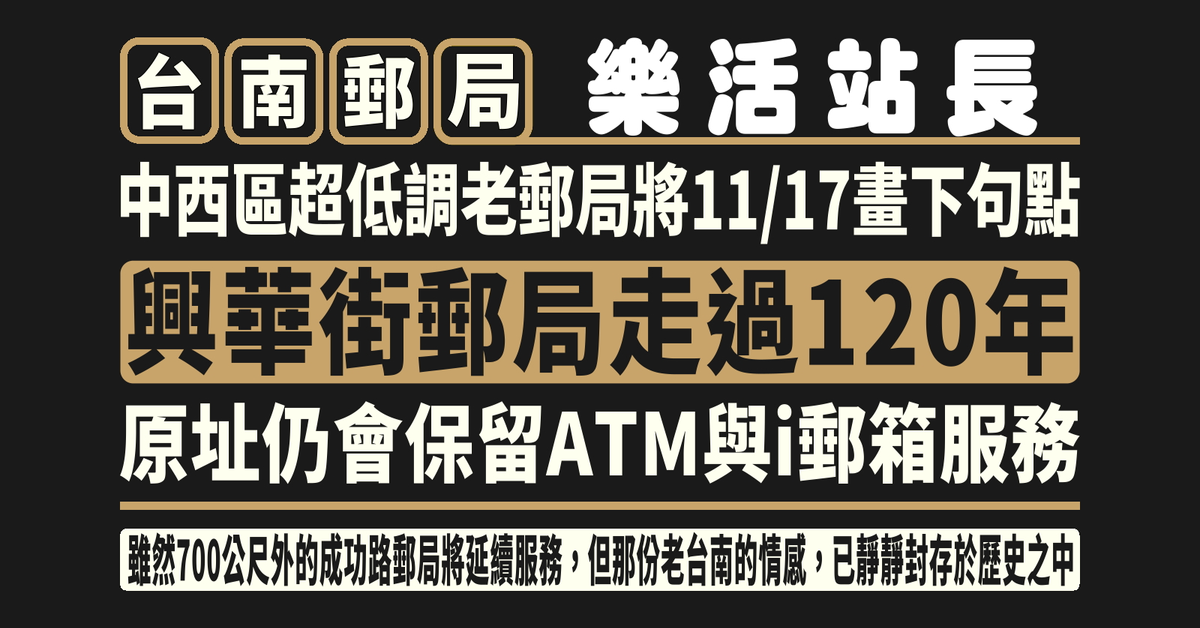 120年老郵局畫下句點!台南興華街郵局11月17日正式併入成功路郵局 中華郵政宣布,創立於日治時代、擁有120年歷史的台南興華街郵局,將於2025年11月17日正式結束營業,所有業務併入台南成功路郵局。 興華街郵局鄰近「東菜市」,長年服務在地居民與攤商,是許多人日常生活的一部分。 郵局指出,隨著銀行120年老郵局畫下句點!台南興華街郵局11月17日正式併入成功路郵局 中華郵政宣布,創立於日治時代、擁有120年歷史的台南興華街郵局,將於2025年11月17日正式結束營業,所有業務併入台南成功路郵局。 興華街郵局鄰近「東菜市」,長年服務在地居民與攤商,是許多人日常生活的一部分。 郵局指出,隨著銀行120年老郵局畫下句點!台南興華街郵局11月17日正式併入成功路郵局 中華郵政宣布,創立於日治時代、擁有120年歷史的台南興華街郵局,將於2025年11月17日正式結束營業,所有業務併入台南成功路郵局。 興華街郵局鄰近「東菜市」,長年服務在地居民與攤商,是許多人日常生活的一部分。 郵局指出,隨著銀行